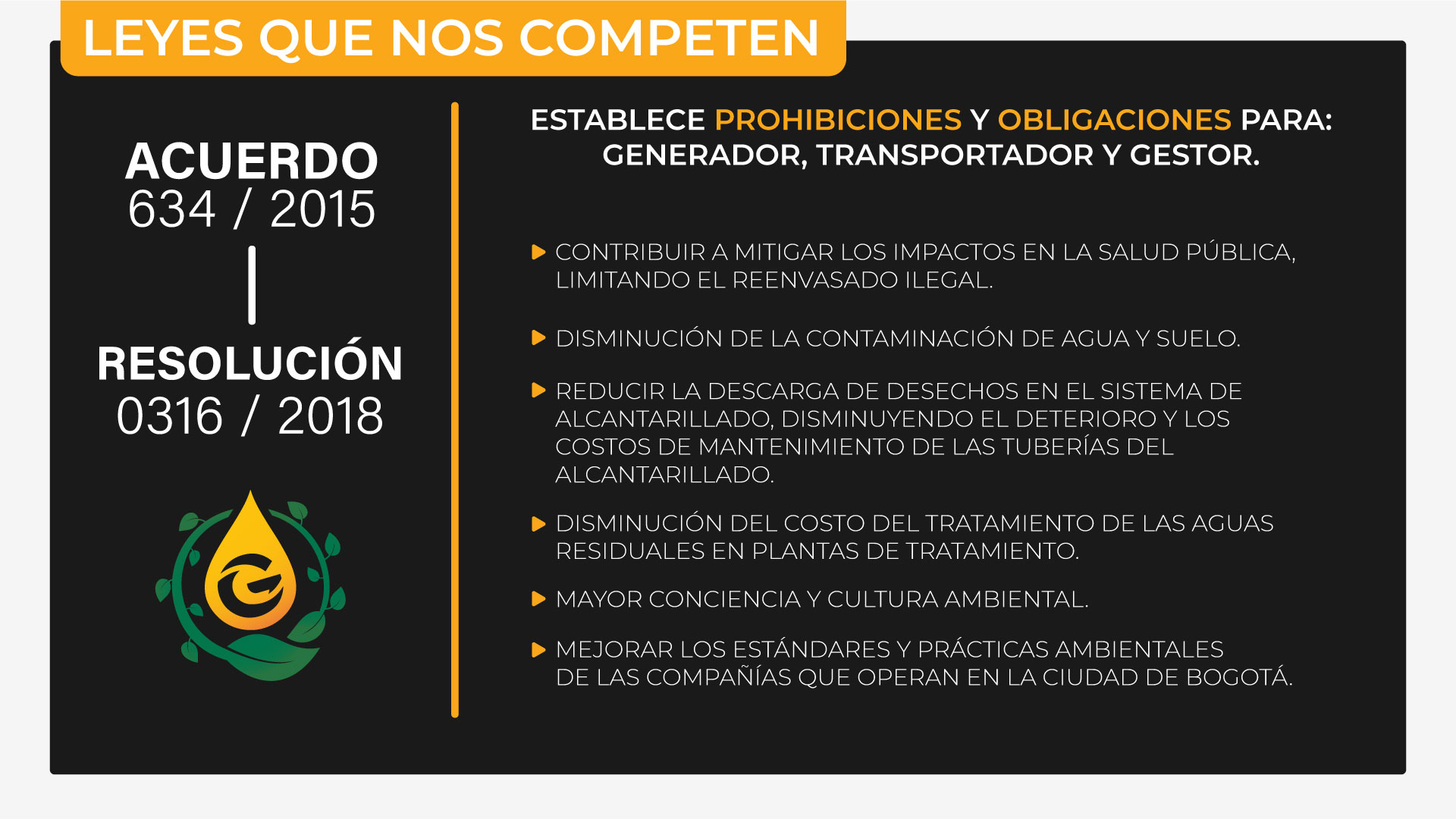 Somos una empresa COLOMBIANA líder a nivel nacional, que ofrece soluciones integrales para la gestión de Aceites de Cocina Usado (ACU) y otras grasas de origen vegetal o animal, con altos estándares de calidad y seguridad, comprometida con la atención preferencial y satisfacción de nuestros clientes, brindamos a grandes, medianas y pequeñas empresas del sector gastronómico e industrial. Nuestro objetivo es prevenir y minimizar el impacto en la salud y el medio ambiente, con altos estándares de responsabilidad ética y social, bienestar para nuestros colaboradores y la comunidad en general, cumpliendo la normatividad legal vigente.